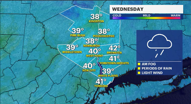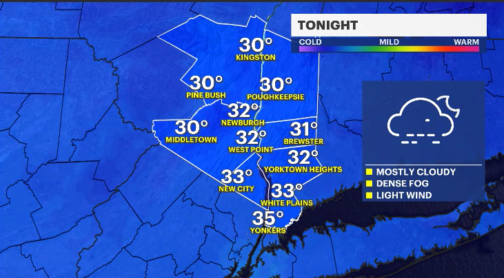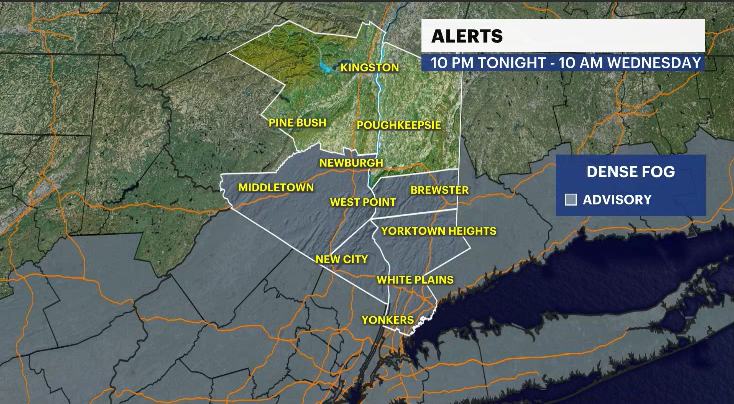 A dense fog advisory will be in effect for Orange, Putnam, Rockland, and Westchester counties from 10 p.m. until 10 a.m. Wednesday. Visibility is expected to be less than a quarter of a mile during that time period. Remember to use your low beams, and use caution when driving.