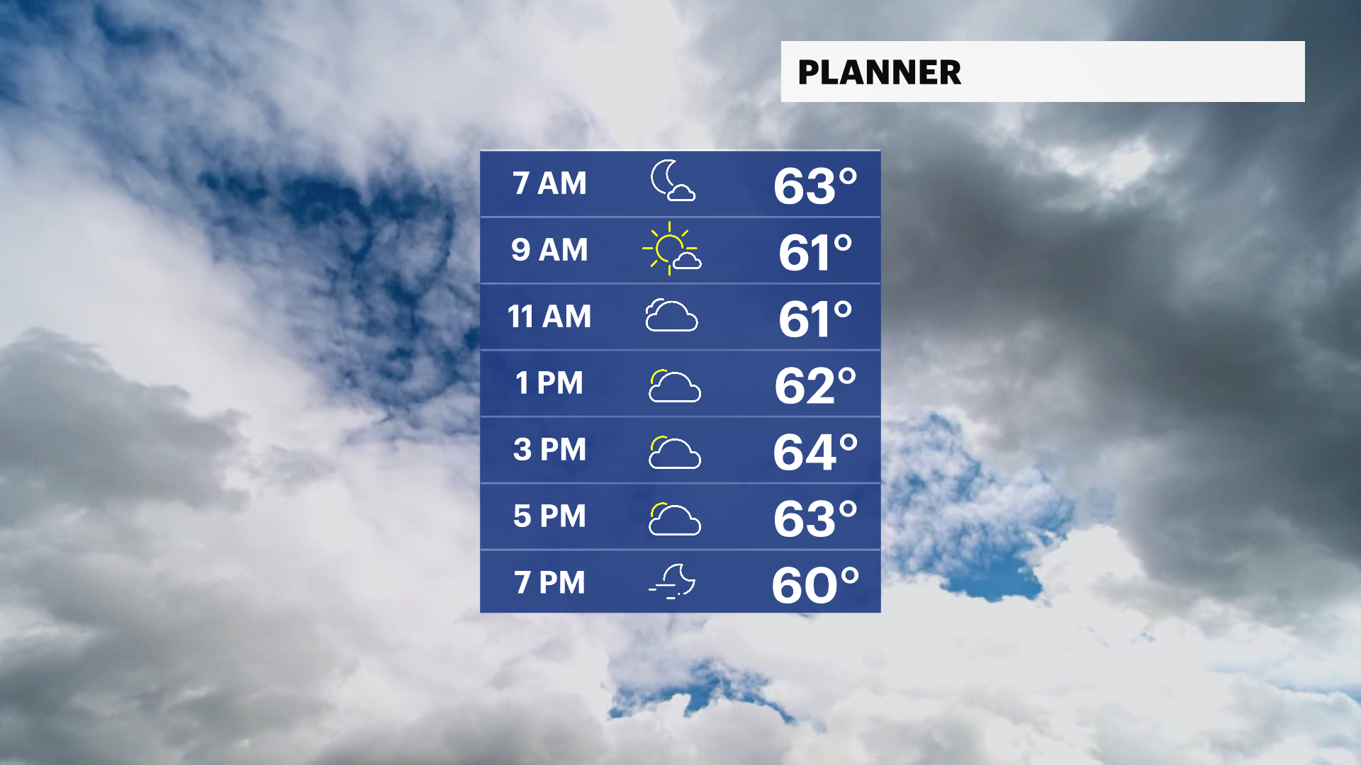 Overnight gusty showers continue to move east this morning, leaving behind clouds, damp and wet roads for the morning commute. Temperatures are cool in the mid to upper-60s this morning. Clouds and sun take us through this afternoon with a cooler wind and highs dropping to the low-60s.