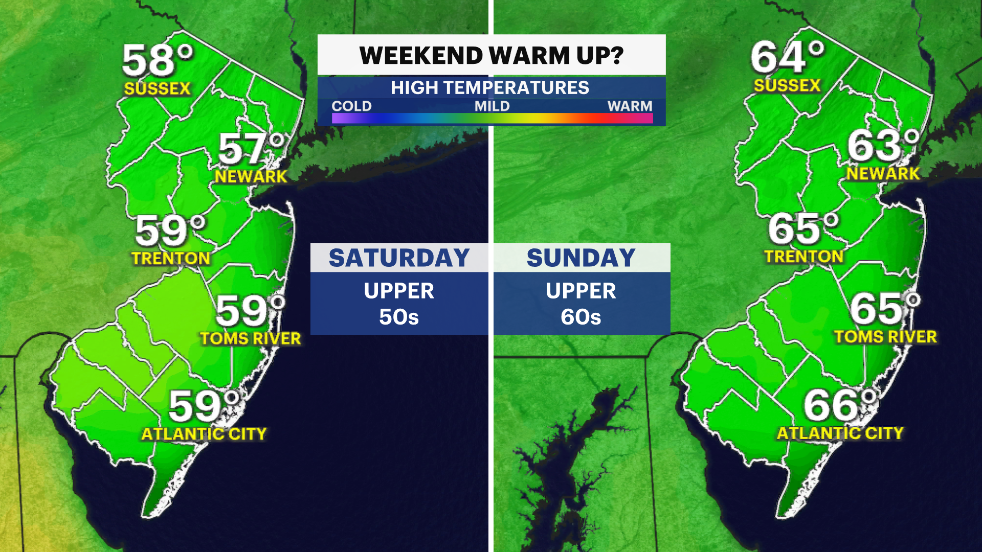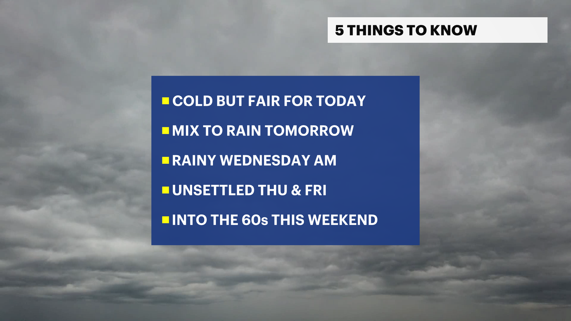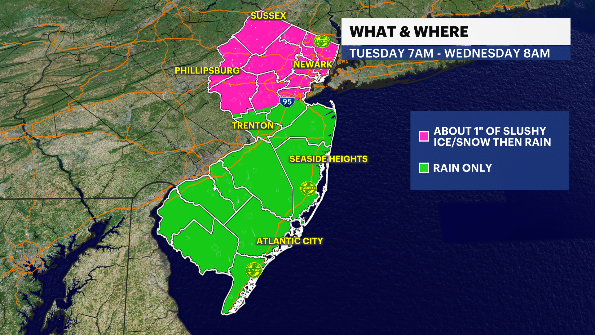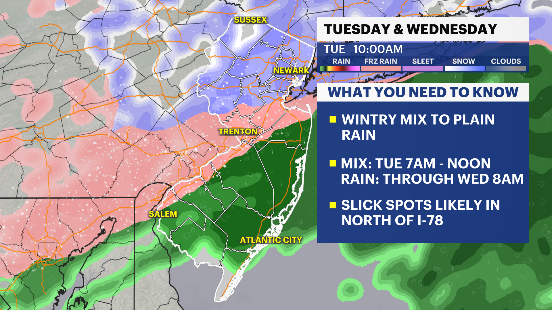 Today's weather is quiet, dry, and cold with highs near the mid-30s under a mostly cloudy sky. Not much is happening for now, but a storm is brewing to the south that will lift across New Jersey through Tuesday and Wednesday. This storm isn't major, but impacts can be notable on Tuesday morning from 7 a.m. to noon with a light slushy accumulation of ice and snow from I-78 and points north. This will be brief as it changes over to rain after noon. The plain rain continues throughout Tuesday, moderate at times at night. The rain continues until about 8 a.m. on Wednesday before departing. Wednesday's weather features improvement with emerging sunshine and fair weather. Highs push to the lower 50s. Unsettled weather arrives for Thursday and Friday with mostly cloudy conditions and random periodic showers/sprinkles as a result of a nearby stationary front. Temperatures surge by the weekend to the upper 50s and even the upper 60s. Some spots may make a run for near 70 degrees on Sunday coupled with sunshine.