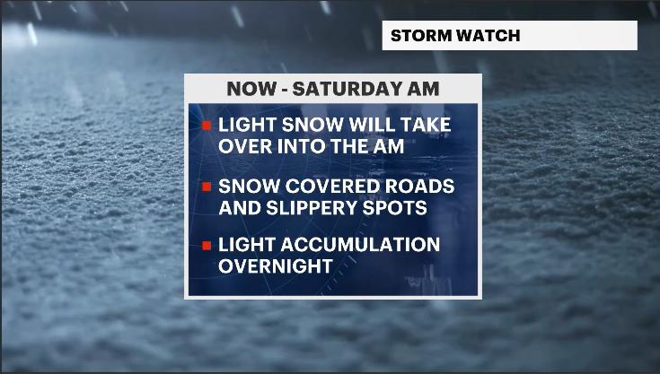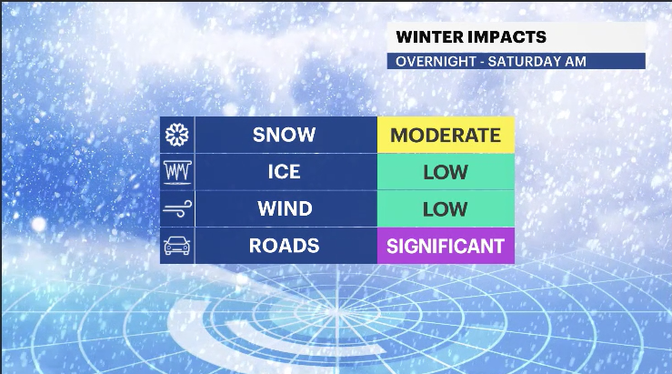 The impacts and hazards remain the same. Snow-covered roads, slippery walkways, and snow-covered residential areas will continue to be an issue through early Saturday morning. Be mindful of some icy spots that could form overnight as well.