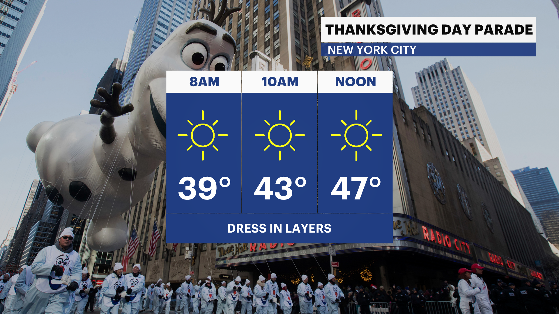 Thursday (THANKSGIVING): Sunny, chilly and less breezy. Highs near 49. Lows near 38.