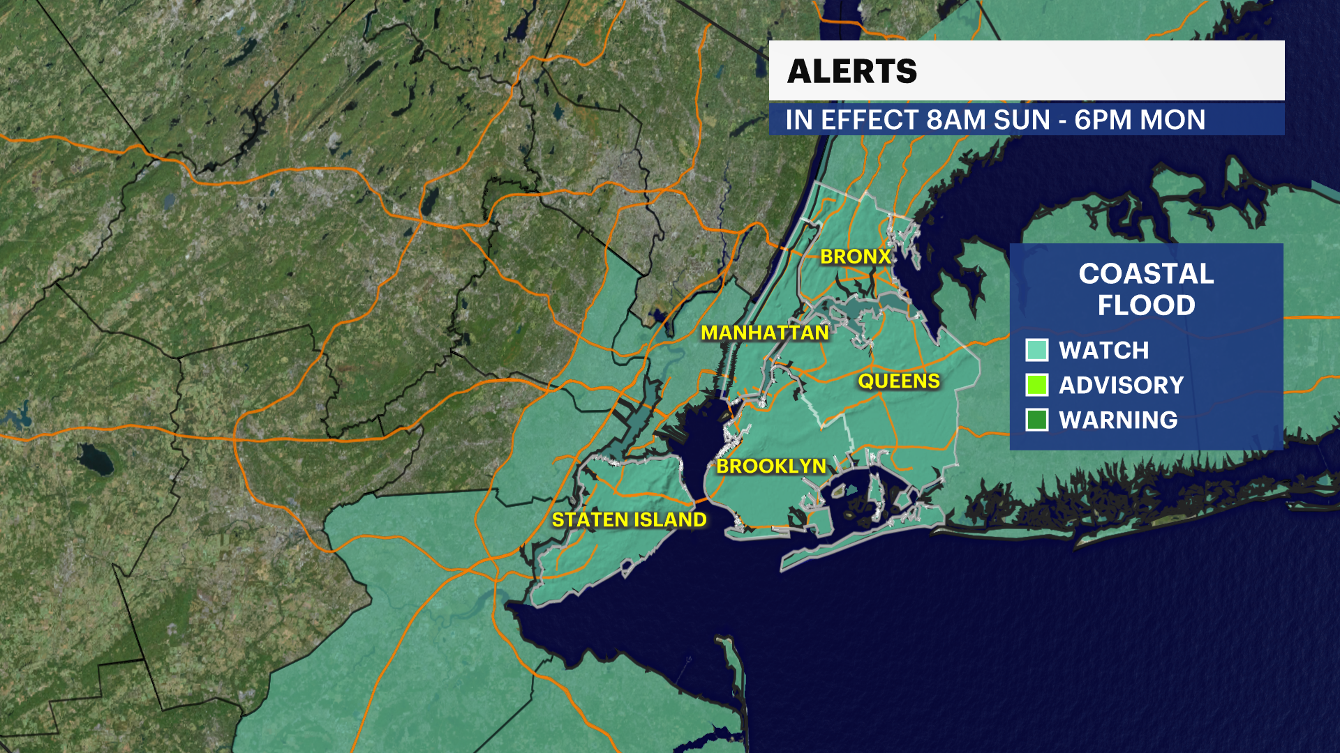- High tides times for the Bronx (Throgs Neck) on Sunday are around 4 a.m. and 4 p.m., and around 5:20 a.m. and 5:40 p.m. Monday. For Brooklyn (Coney Island) high tide times will be around 12:40 a.m. and 12:20 p.m. on Sunday and 1:20 a.m. and 1:40 p.m. on Monday. Stay tuned for updates!