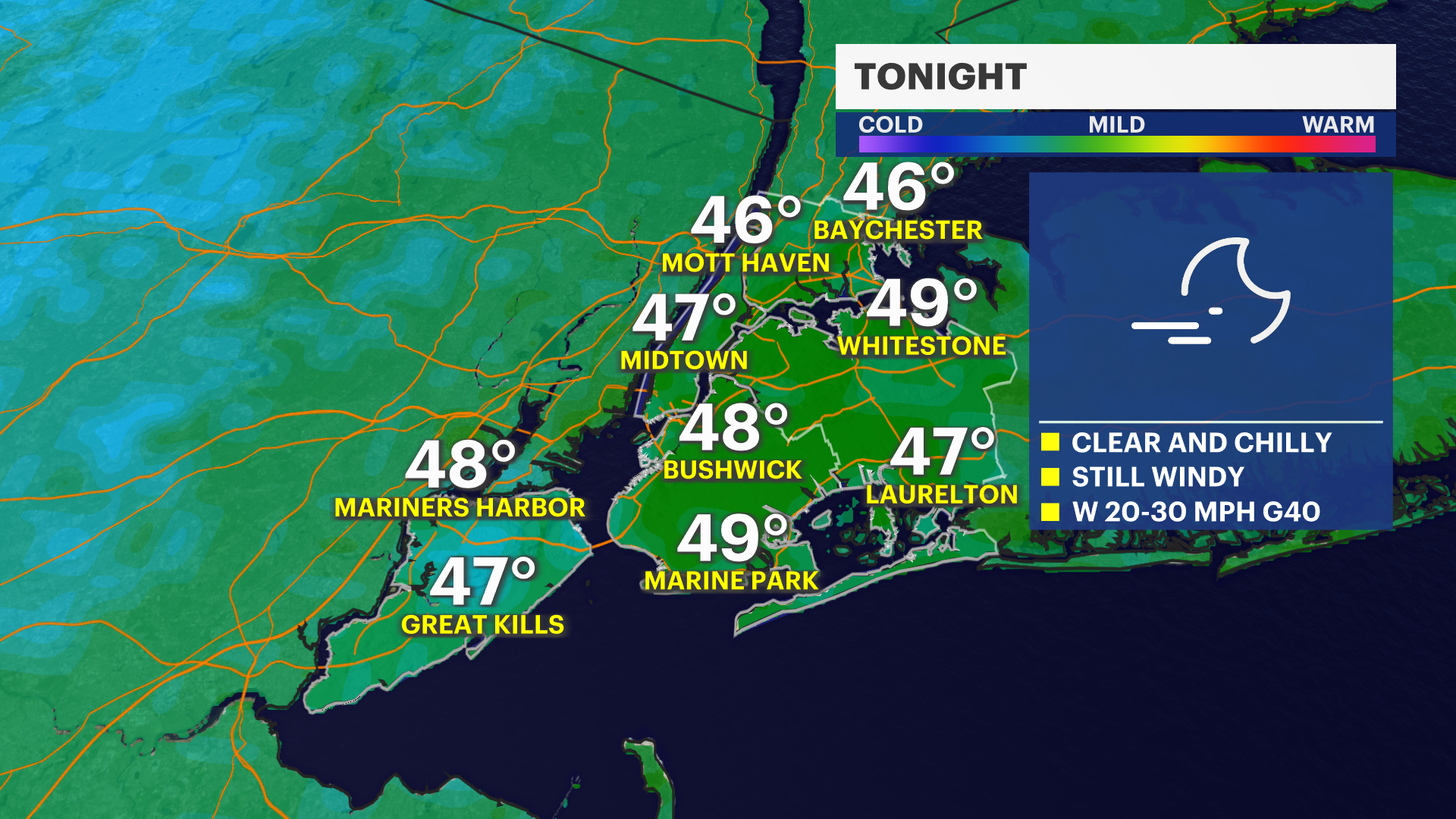 OVERNIGHT: Mostly clear, chilly and still windy. Lows near 46.