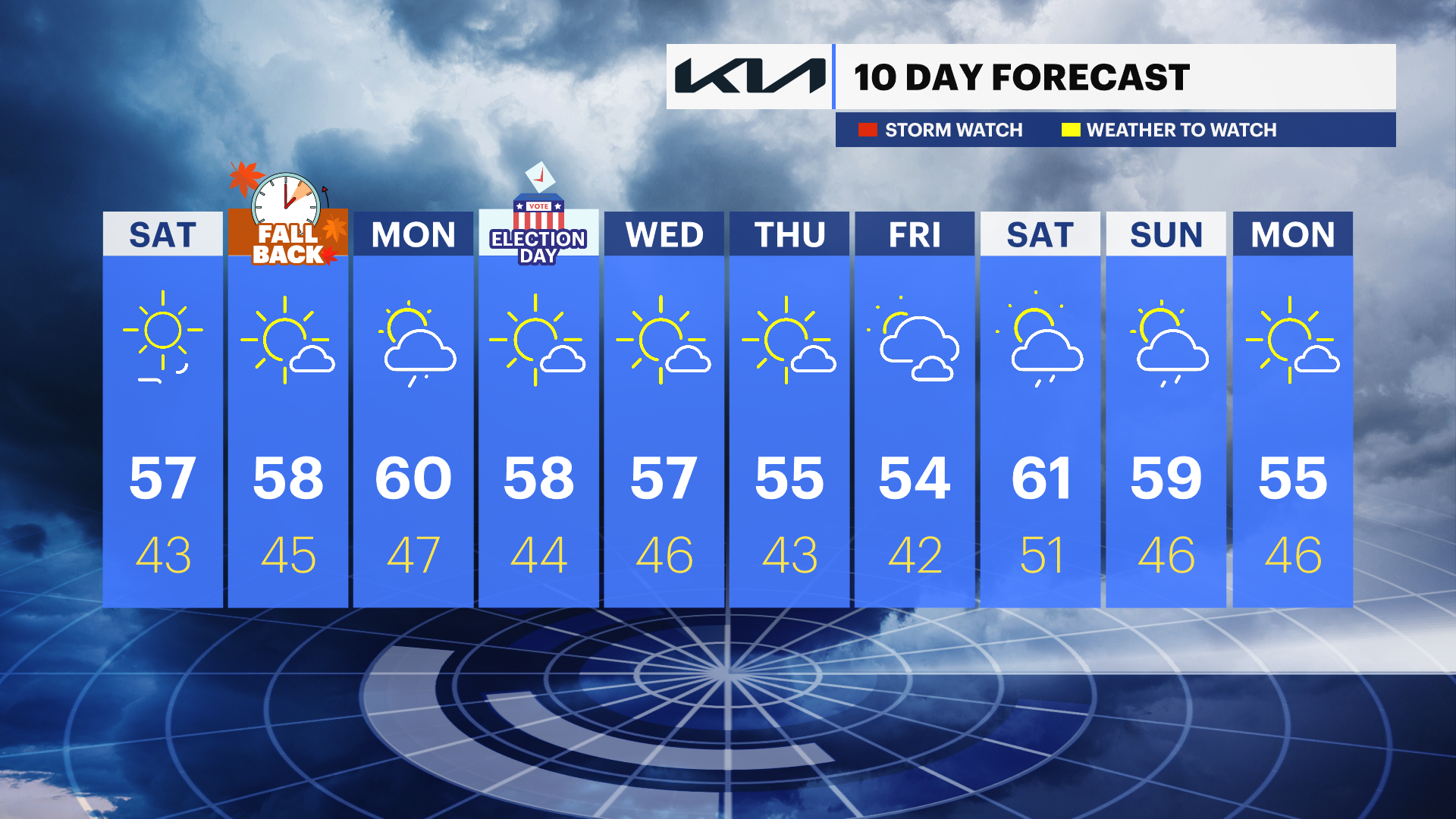 Sunday brings another pleasant day with mostly sunny skies, light breezes, and highs near 57. Clouds increase Sunday night as the next rain system approaches.