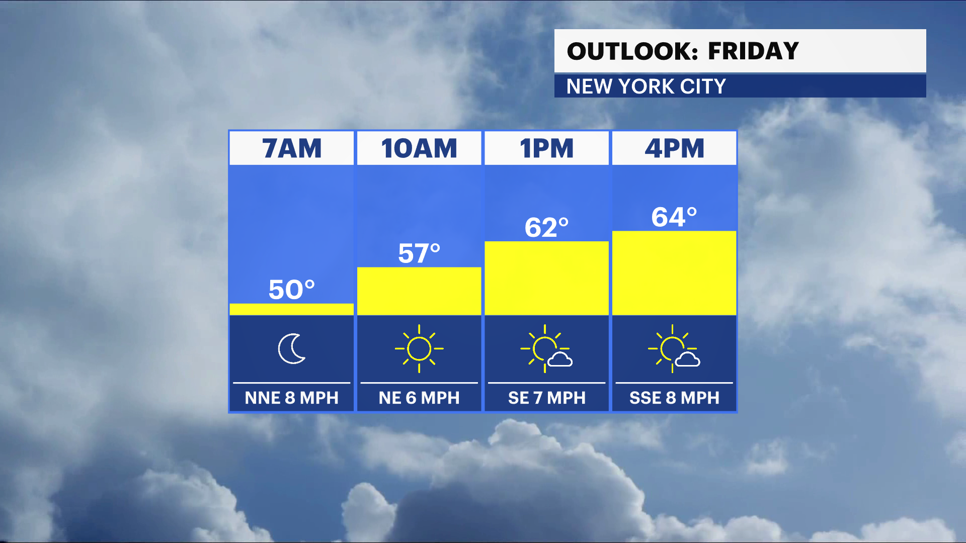 Thursday: Mostly sunny, nice and cool. Highs near 63. Lows near 53.