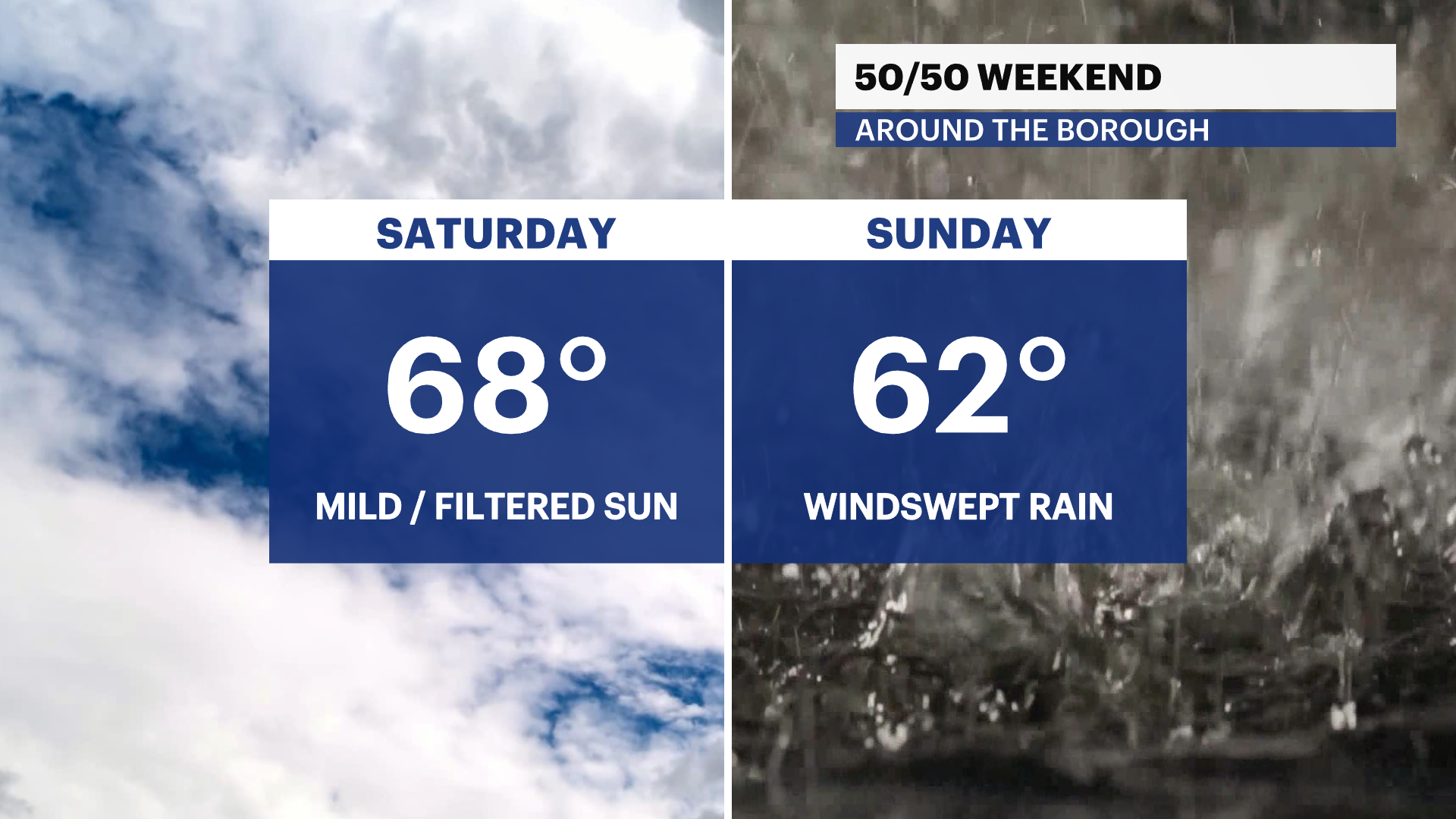 Saturday: Filtered sunshine, near seasonable and nice. Overnight rain. Highs near 68. Lows near 56.