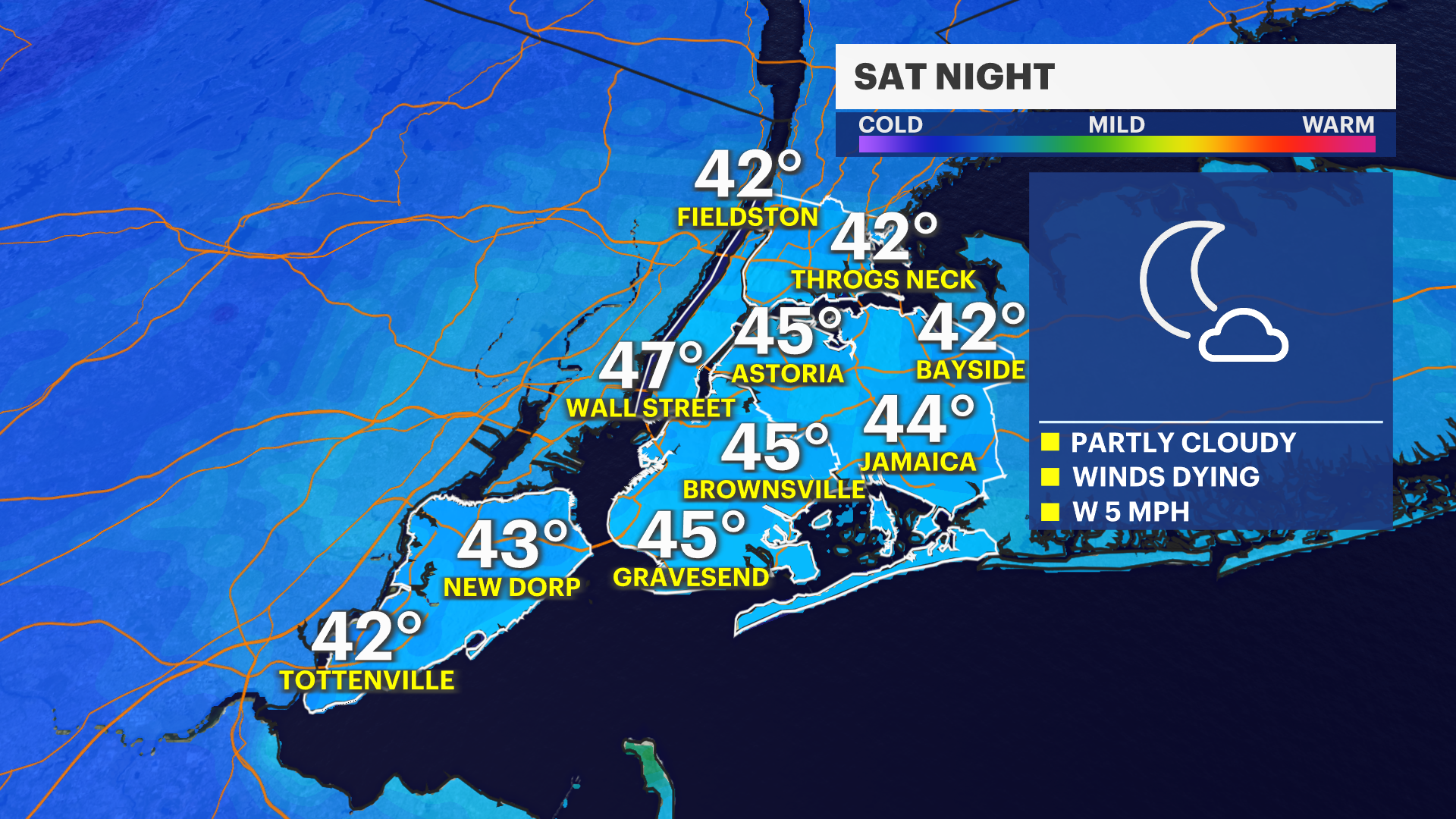Saturday night will be partly cloudy and cool with lows in the low 40s.