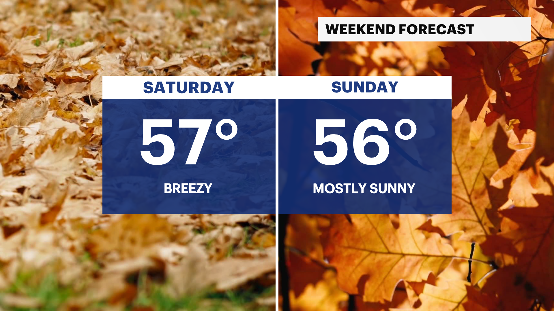 Saturday will be sunny and seasonable, with lighter winds, though it will still feel breezy, and highs in the upper 50s.