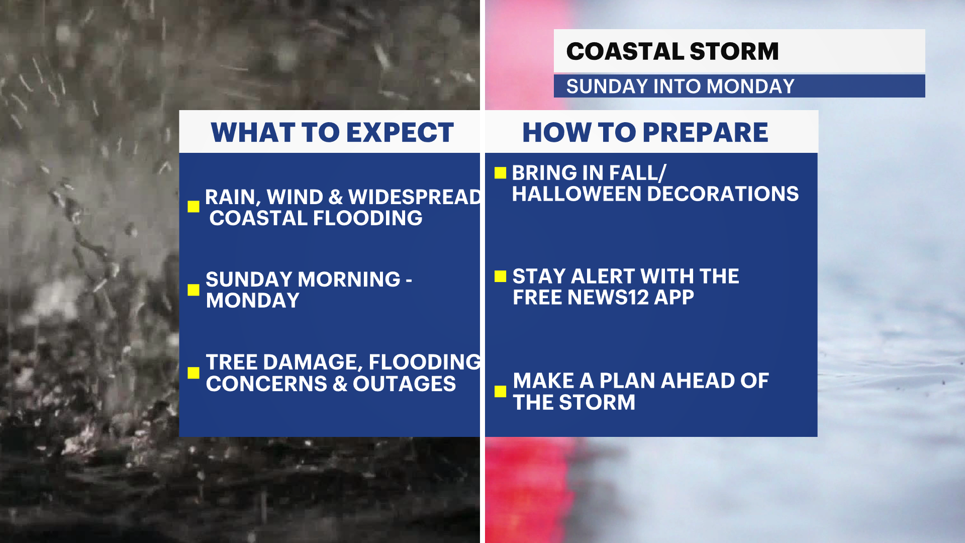 - A nor'easter will move into our area Sunday into Monday. Rounds of rain will bring 1-2 inches + of rainfall with locally higher amounts. The worst of the storm will be at the coast. Wind gusts of 30-50mph will be at the coast. Large breaking waves between 8-12 feet will bring beach erosion to our ocean facing beaches. Minor to moderate coastal flooding at high tide is expected Sunday morning through Monday evening.