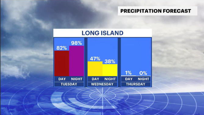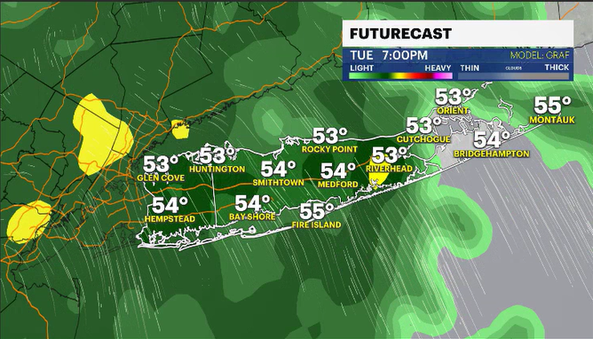 TUESDAY: Cloudy, breezy, mild. Rain is expected to develop in the early afternoon and through the night. The rain will be light and moderate at times, but some heavy periods cannot be ruled out. Highs in the mid-50s. Lows near 50 degrees.