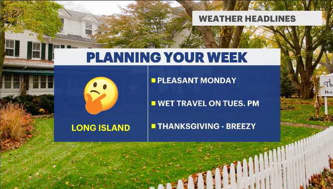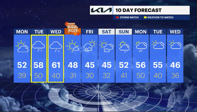The holiday week starts decently but quickly has a few hurdles to jump over before the big day. On Monday, expect a sunny and chilly start with periodic gusts near 20 mph. The day will remain dry, and sunshine will hang around. By night, cloud cover will increase, setting the stage for the approaching weather system that will bring rain on Tuesday.