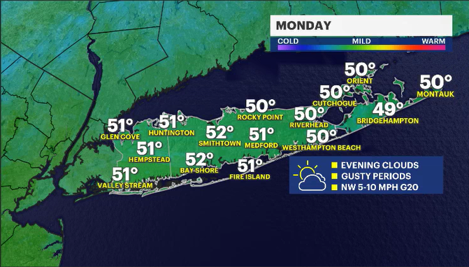 MONDAY: Mostly sunny and chilly in the morning. Temperatures will warm near seasonable by the afternoon. Clouds will increase at night as the wind weakens. Highs in the low 50s. Lows in the upper 30s.