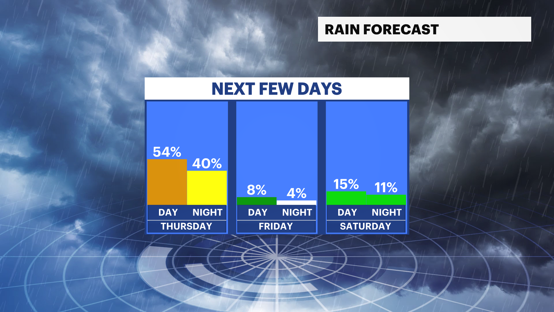 NEXT: Rain arrives overnight tonight and is on and off through Thursday morning. A spotty storm is possible in the afternoon.