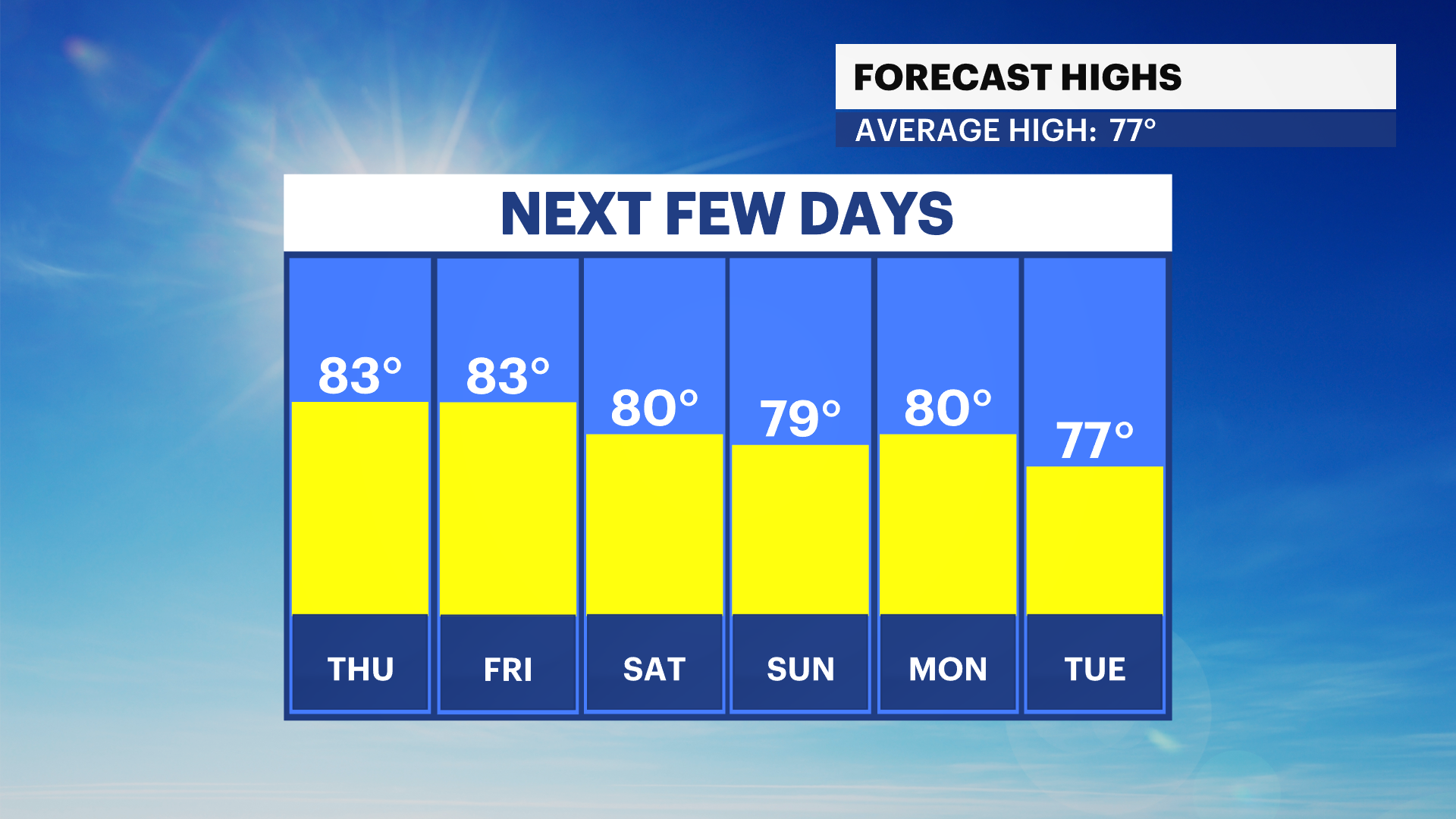 SUNDAY: Almost the same as Saturday, with just a few more clouds and a stray evening shower. Highs near 79. Lows near 64. 95% of the weekend will be dry.