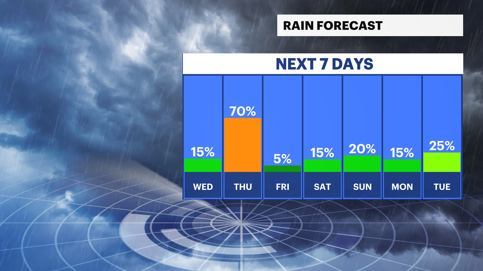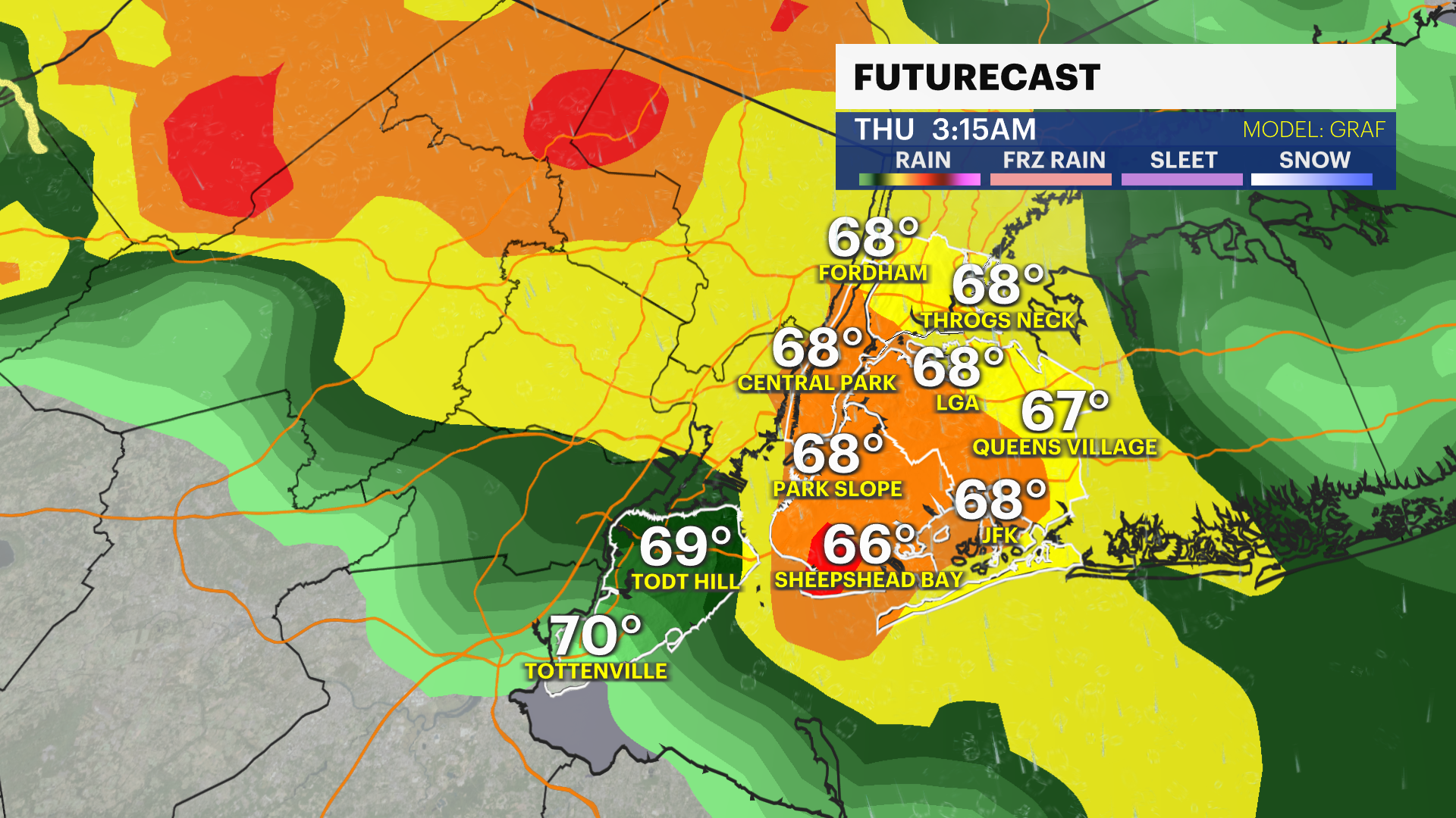 TONIGHT - STORM WATCH: A stray shower possible before midnight, with a few downpours likely between 12 and 6AM. Minor flooding/ponding possible, no other impacts expected. Lows near 69.