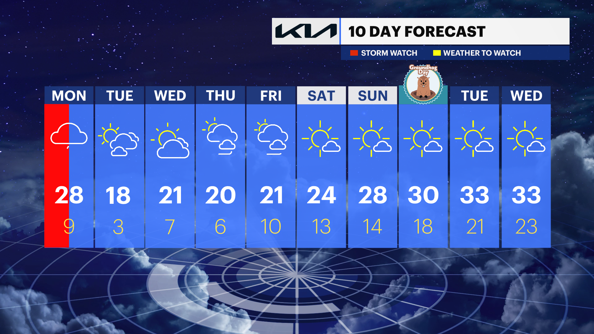 WEDNESDAY: Mostly sunny to cloudy. Highs: upper teens to low 20s. Lows: mid single digits