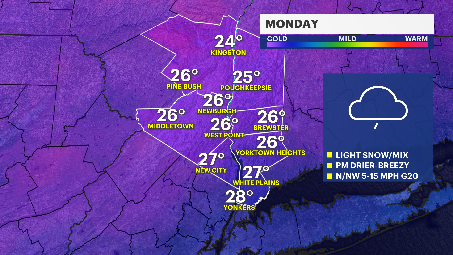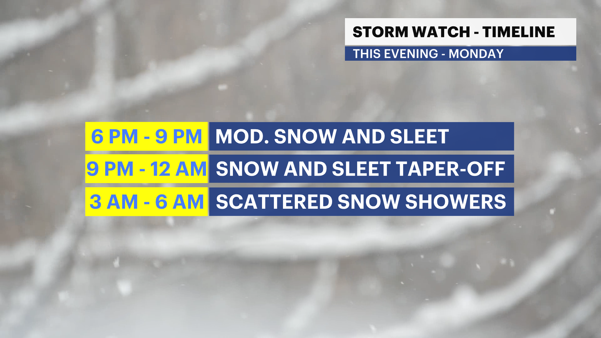 MONDAY: STORM WATCH (AM) - Snow & a wintry mix tapering off by midday with breezy winds and frigid temps to follow. Highs: upper 20s. Lows: upper single digits to low teens.