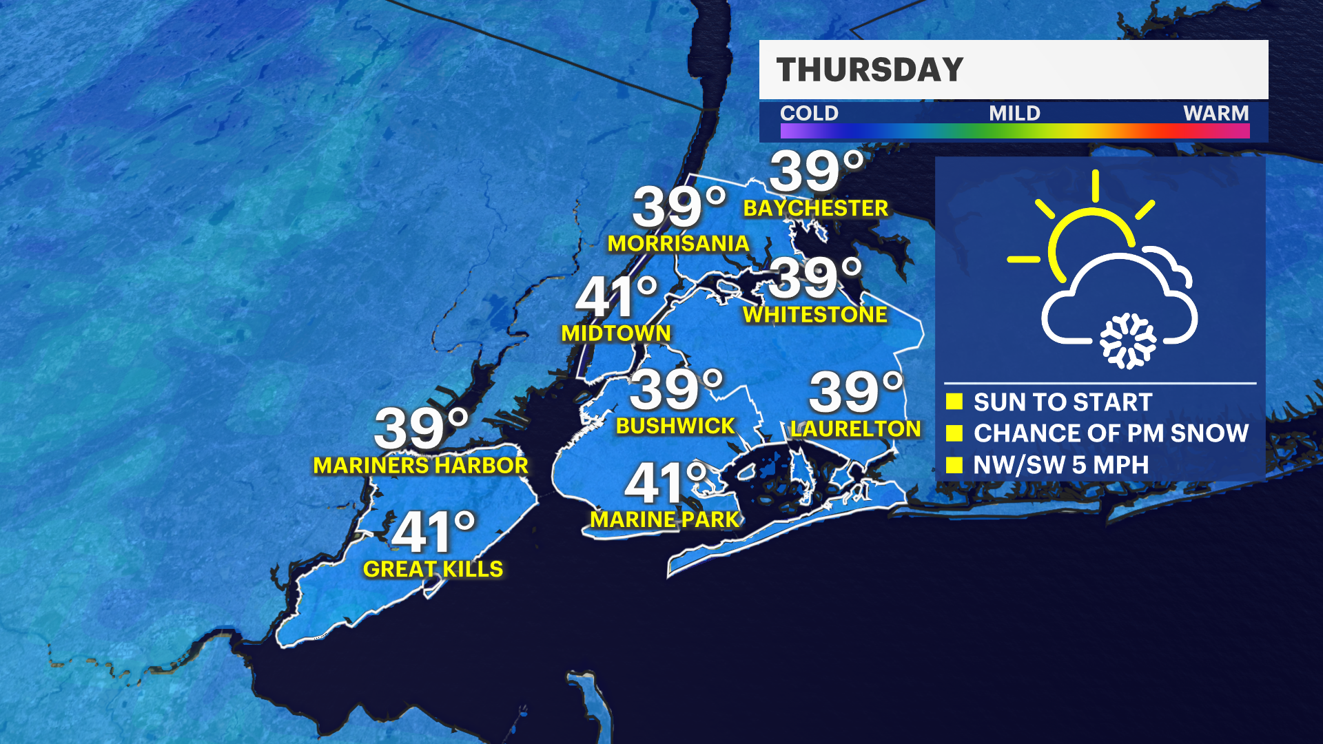The News 12 Storm Watch Team is keeping an eye on a stronger storm system for early next week. Guidance as of Thursday evening has this still wanting to stay more to the south-- but there is still the potential for the borough to see snow, ice, and rain. Friday and Saturday will feel quite nice, with temperatures nearing 50 degrees on Saturday. Monday's forecast temperatures are the coldest they will be over the next week. Warmer temperatures (in the 40s and potentially near 50) will quickly follow.