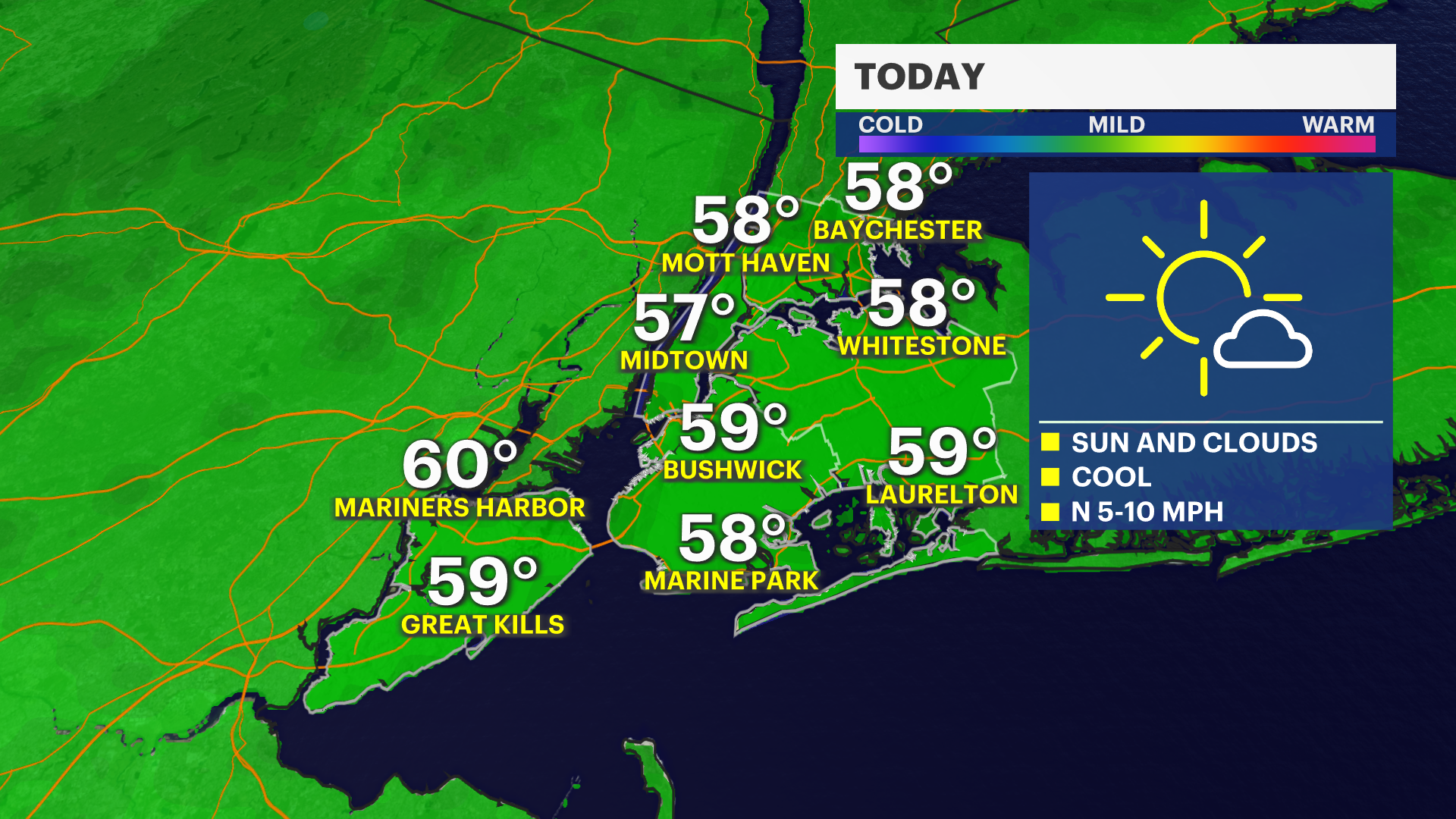 SUNDAY: Similar to Saturday. Highs in the upper 50s. Mix of sun and clouds.