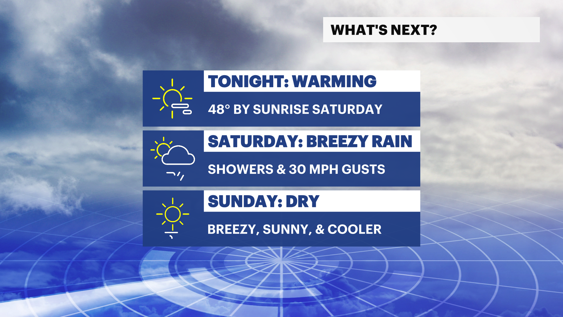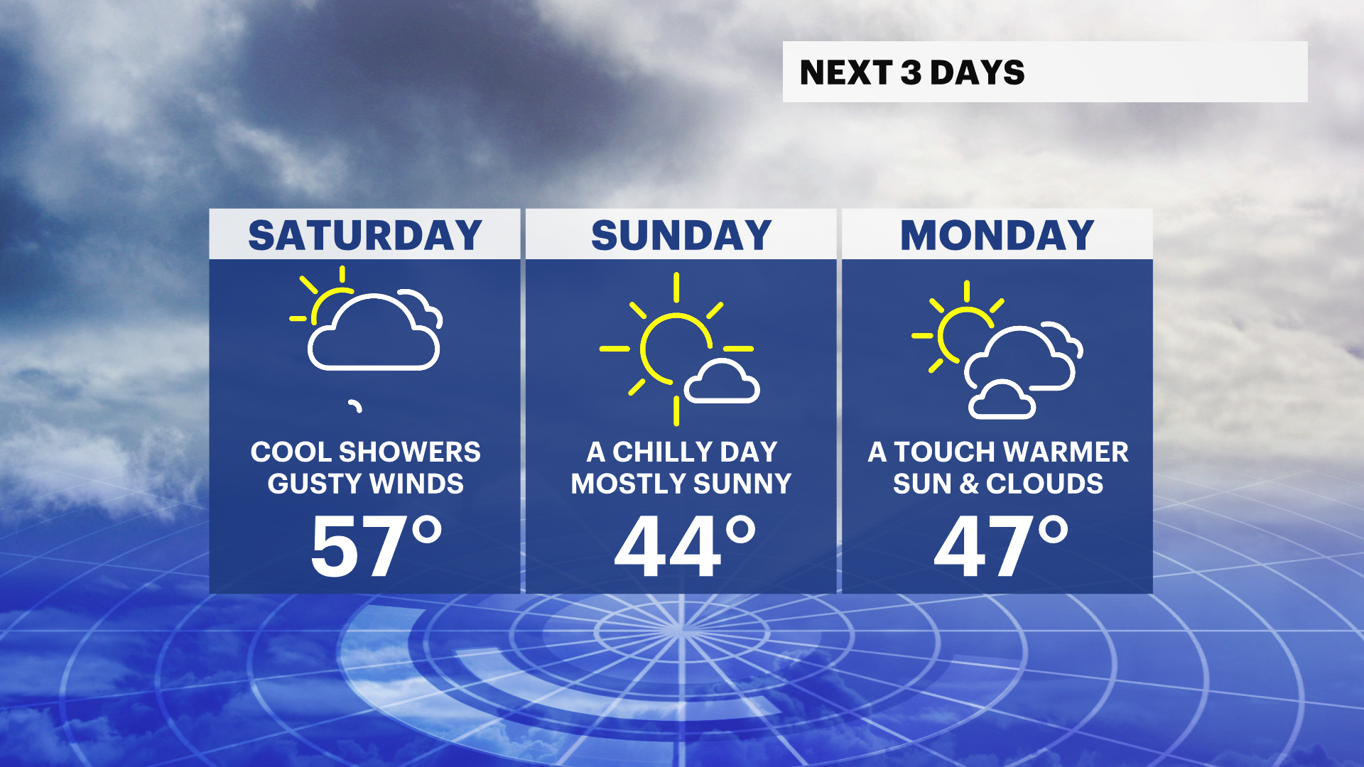 SATURDAY: Clouds and rain, highs from the mid- to upper-50s and gusty.