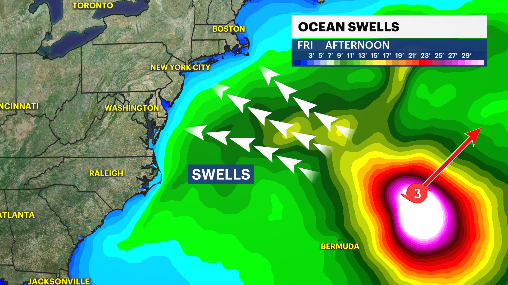 Hurricane Earl is rapidly intensifying as it makes its closest approach to Bermuda. Higher swells and dangerous rip currents for New York City's southern facing beaches.