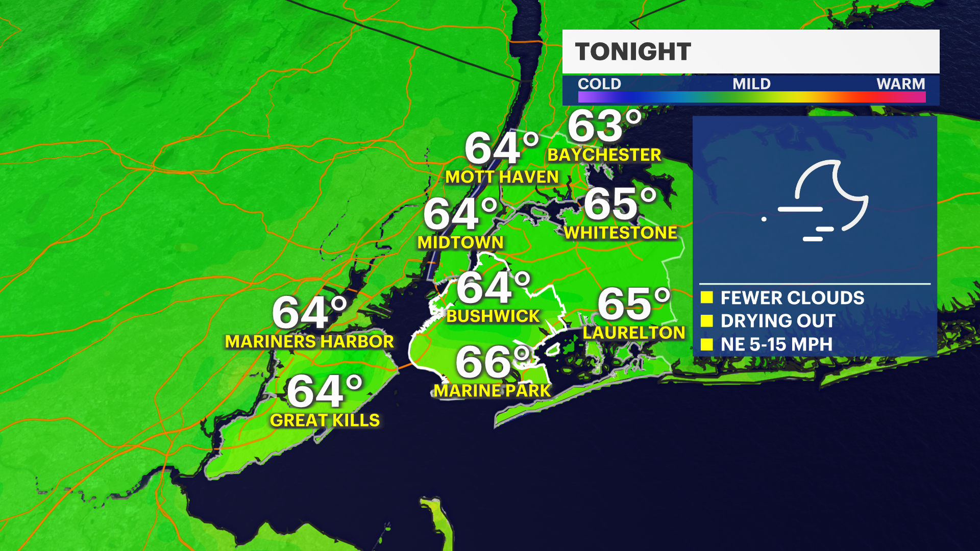 Overnight: Partial clearing, cool and not as breezy. Lows near 65.