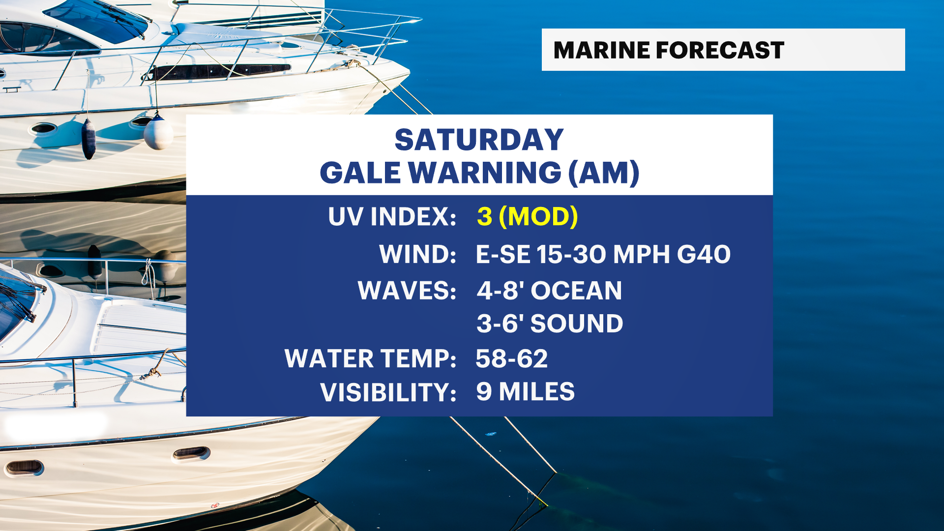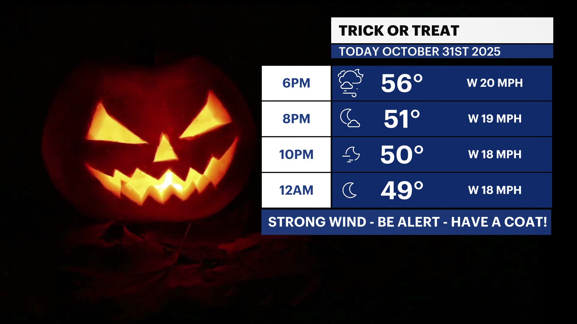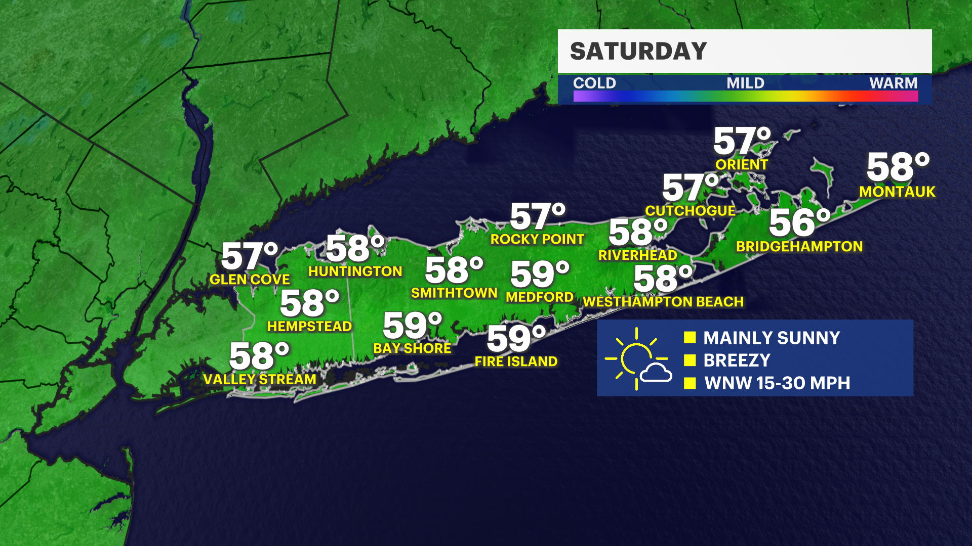 SATURDAY: Mostly sunny to partly cloudy. Breezy. Wind: west-northwest 15 to 30 mph. Highs around 59 degrees. Lows near 40 degrees.