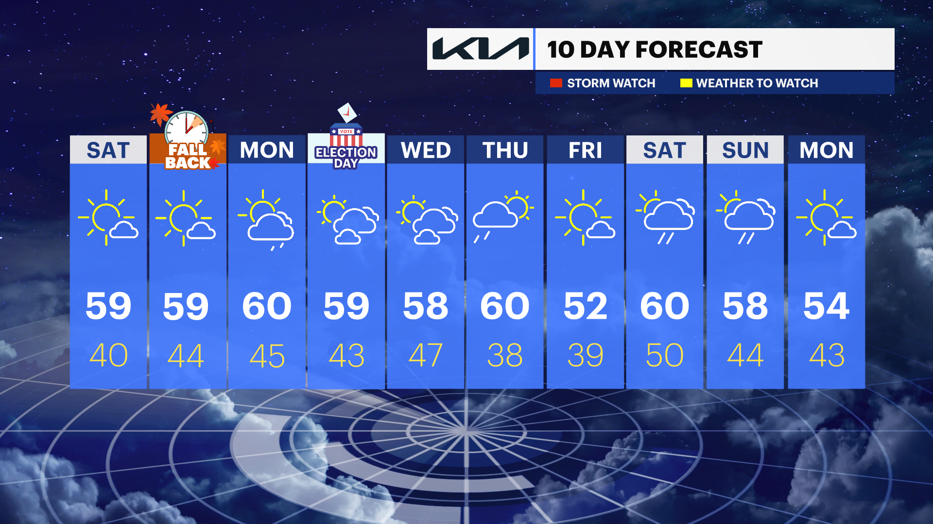 SUNDAY: FALL BACK — DAYLIGHT SAVING TIME ENDS — CLOCKS GO BACK ONE HOUR AT 2 A.M. — Sunrise: 6:24 a.m. Mostly sunny to partly cloudy. Highs around 59 degrees. Lows near 44 degrees. Sunset: 4:47 p.m.