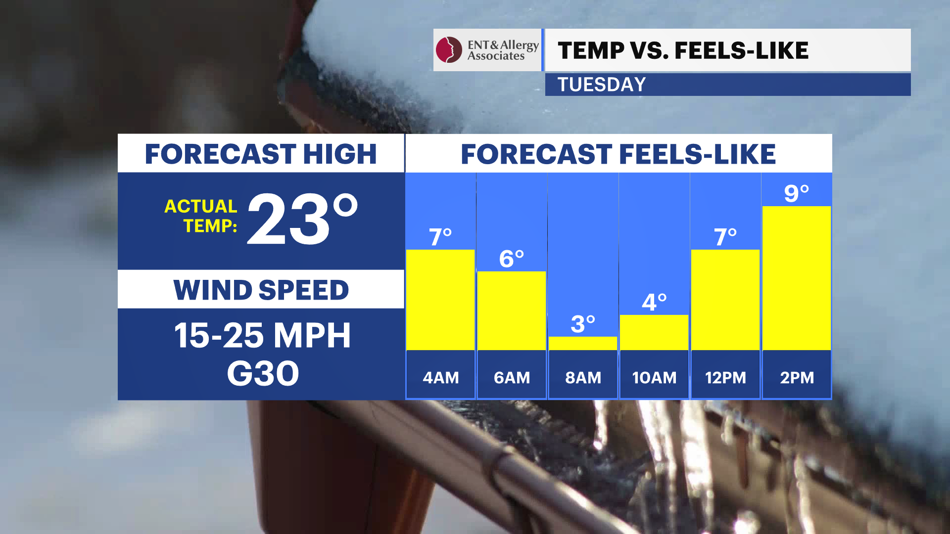 Dangerously cold wind chills will be around on Tuesday. The worst will be in the morning and then again at night.