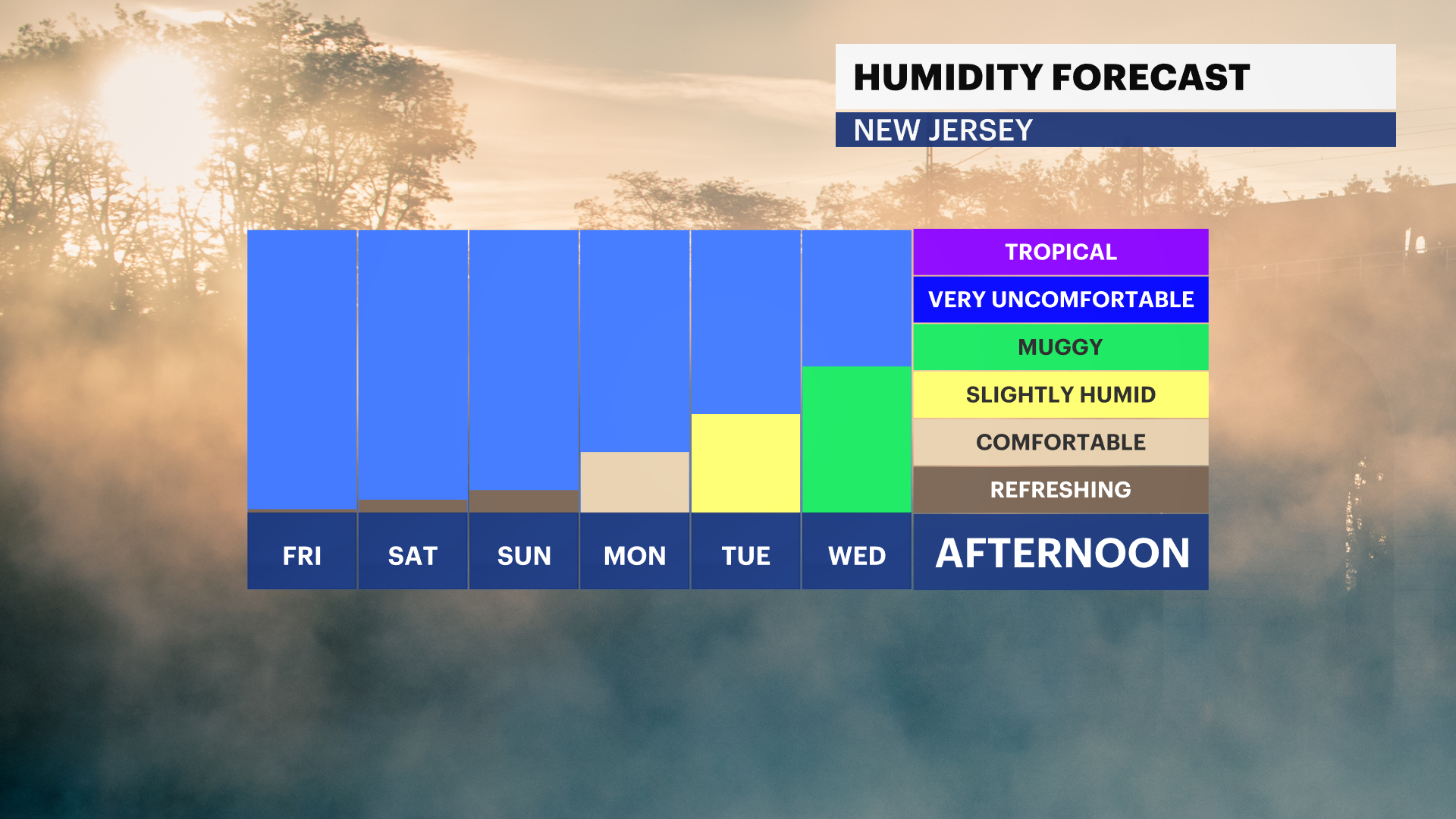 The weather holds nicely into next week with the next chance for rain by Wednesday. Humidity begins to gradually rise early on in the week due to a southwesterly wind.
