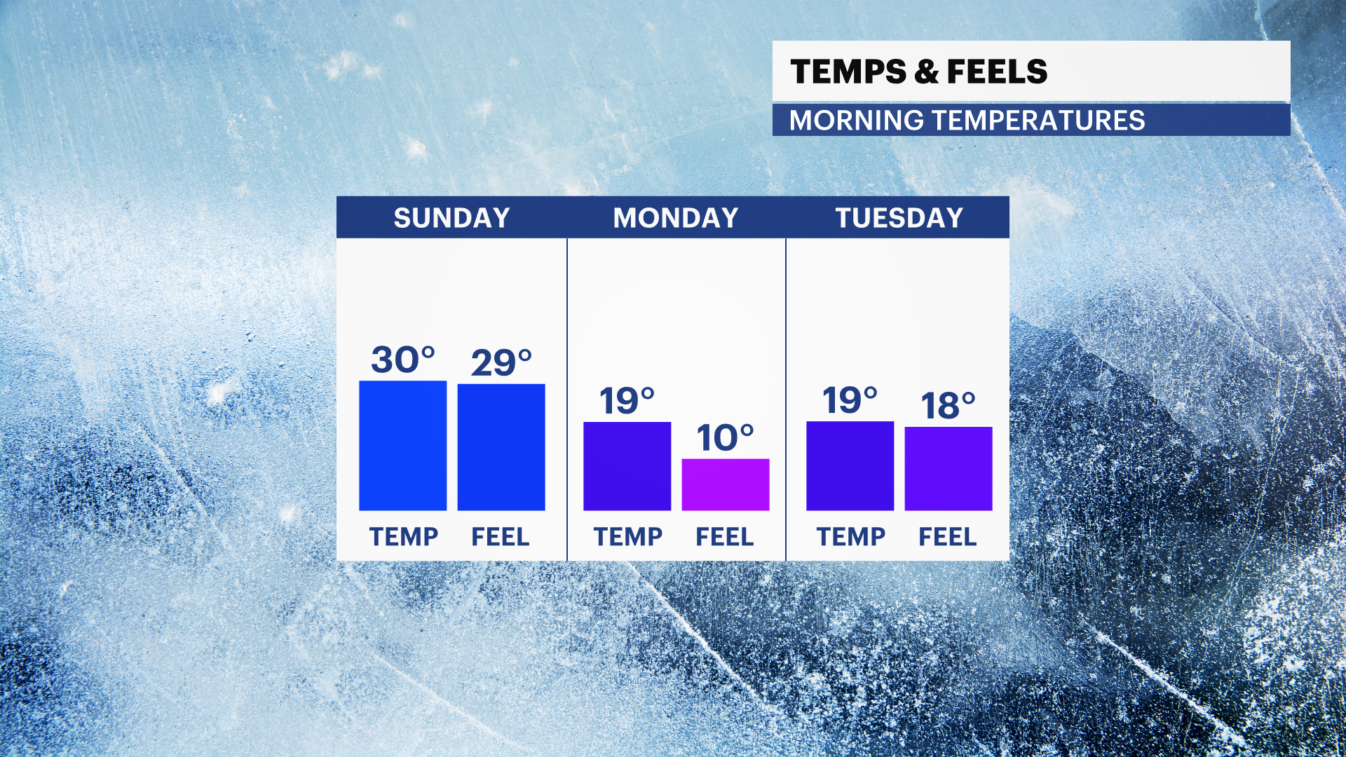 It gets very cold Sunday night and Monday. The snowmelt process will come to a temporary halt. Temperatures will be in the teens Monday morning, with wind chills ranging from about 5 to 10 degrees. Highs in the afternoon will most likely stay below freezing.